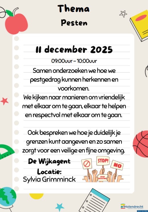 Aanstaande donderdag 11 december bent u van harte welkom bij onze ouderinloop van 09:00 tot 10:00 uur in de ouderkamer. Het thema van deze bijeenkomst is pesten. De wijkagent, onze IB-er Sandra en een medewerker van het ouder-kindteam zullen aanwezig zijn om informatie te geven en vragen te beantwoorden. Heeft u behoefte aan handvatten of maakt u zich zorgen over het gedrag van uw kind? Sluit dan vooral aan; we denken graag met u mee.